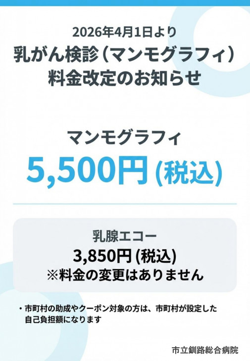 今後もこの検診体制を維持していくため、誠に恐縮ながら2026年4月1日より、マンモグラフィ検診の料金を以下の通り改定させていただくこととなりました。