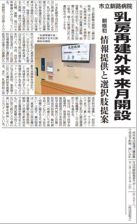 乳房再建外来の開設について令和7年8月25日付 釧路新聞に記事が掲載されました。