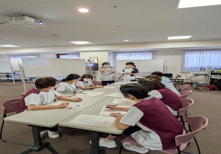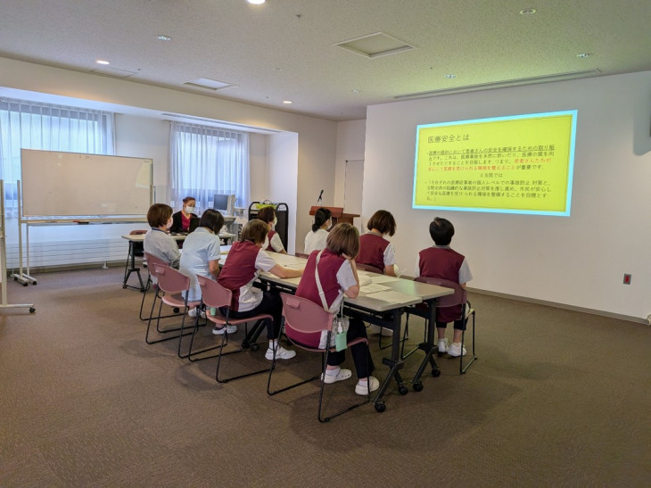 医療安全研修 10月6日、7日、21日 今回は医療安全対策室の松田課長が講師を務め、60名の看護 補助者が参加しました。 当院の医療安全管理指針、医療安全管理体制図、事故発生時のフローについてと、医療事故発生時は速やかに看護師に報告することの講義を受けました。 演習では、患者誤認しないために普段の業務を振り返りました。 看護師から依頼され、患者を検査へ搬送する演習を行いましたが緊張で普段通りに行動できなかった場面もありましたが、予想以上に患者へ配慮して搬送を行っている姿も見られました。 研修を通して、気持ちよくお互いが働き、安全な療養環境つくりを目指していきたいと思います。