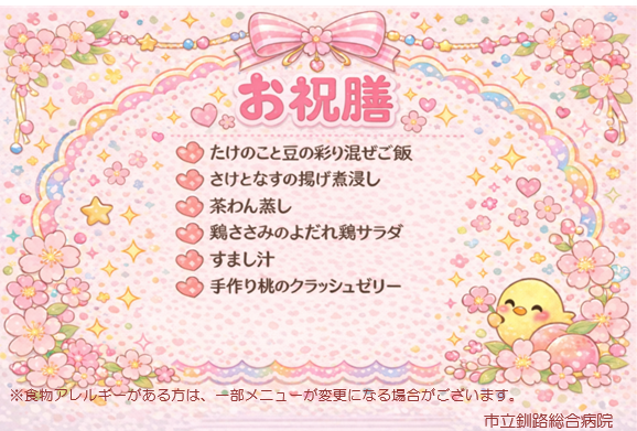 入院中の患者さんに季節を感じていただけるよう、季節のメニューをお出ししています。以下は、メニューをお出しする行事例になります。