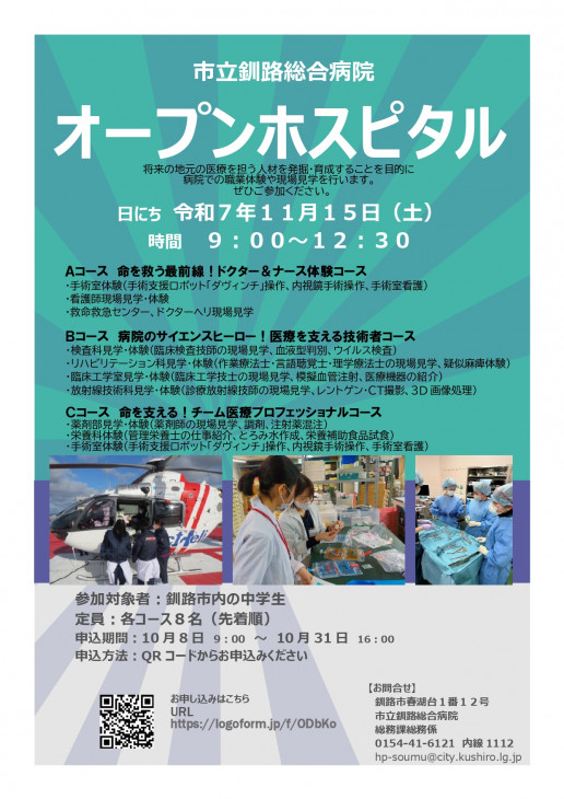 将来の地元の医療を担う人材を発掘・育成することを目的に病院での職業体験や現場見学を行います。ぜひご参加ください。